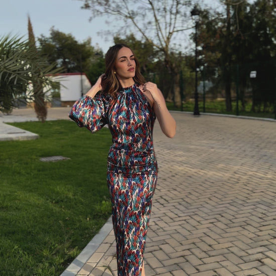 Este vestido destaca por su vibrante estampado abstracto asimétrico en tonos intensos, perfecto para quienes buscan un look llamativo y sofisticado.