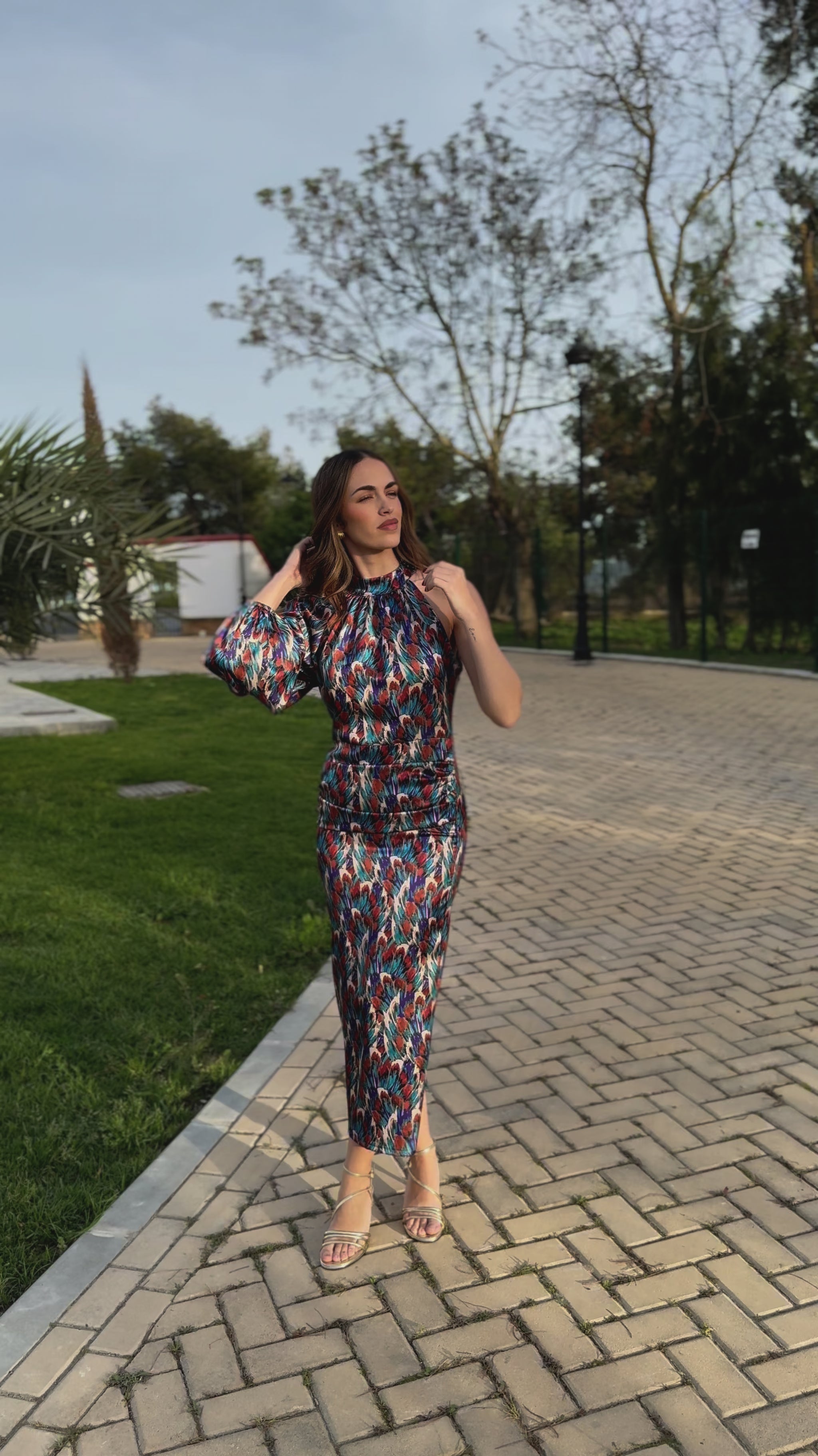 Vestido de largo midi con estampado multicolor, confeccionado en satén, con cuello subido fruncido y manga larga abullonada.